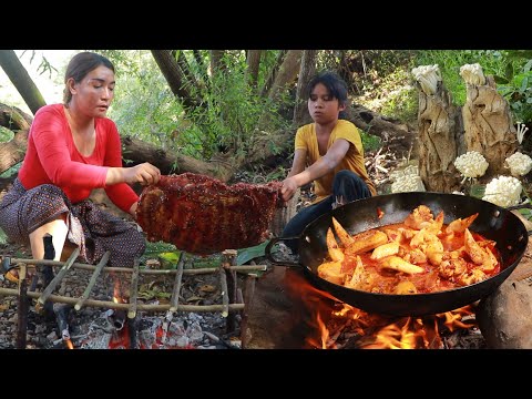 Grilled fresh fish & Chicken for lunch- Cooking pork braised spicy curry so delicious in forestSee more
