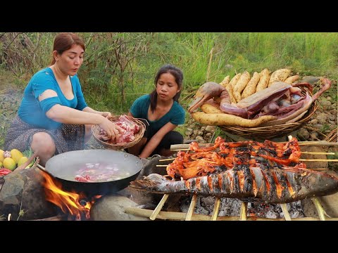 Catch many duck and fish for food of survival-Cooking duck spicy with grill fish for lunch in forestSee more